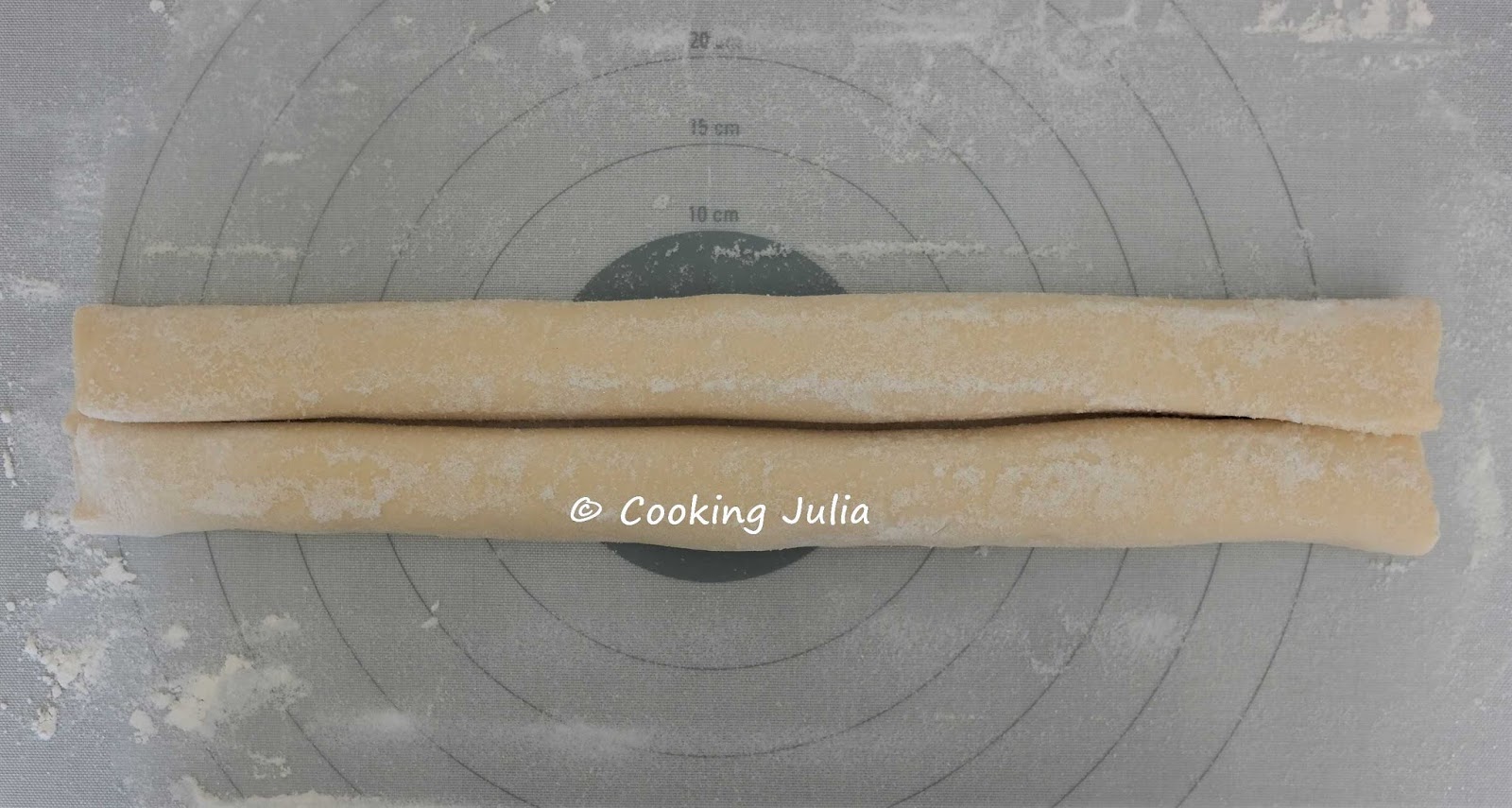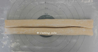 Rouler les deux grands côtés vers le centre en saupoudrant à plusieurs reprises du sucre sur les rouleaux.