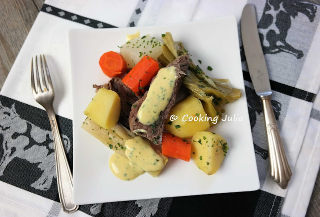 J'ai mélangé deux recettes Thermomix pour en faire une seule. Les légumes cuisent à la vapeur et la viande dans un bouillon parfumé aux légumes et aux aromates. J'avais de la basse-côte et du jarret, mais on peut aussi mettre d'autres morceaux de bœuf à braiser (pour ça, le boucher est de bon conseil). Prévoyez de démarrer la cuisson de bonne heure car elle dure quand même 1 heure 20...
