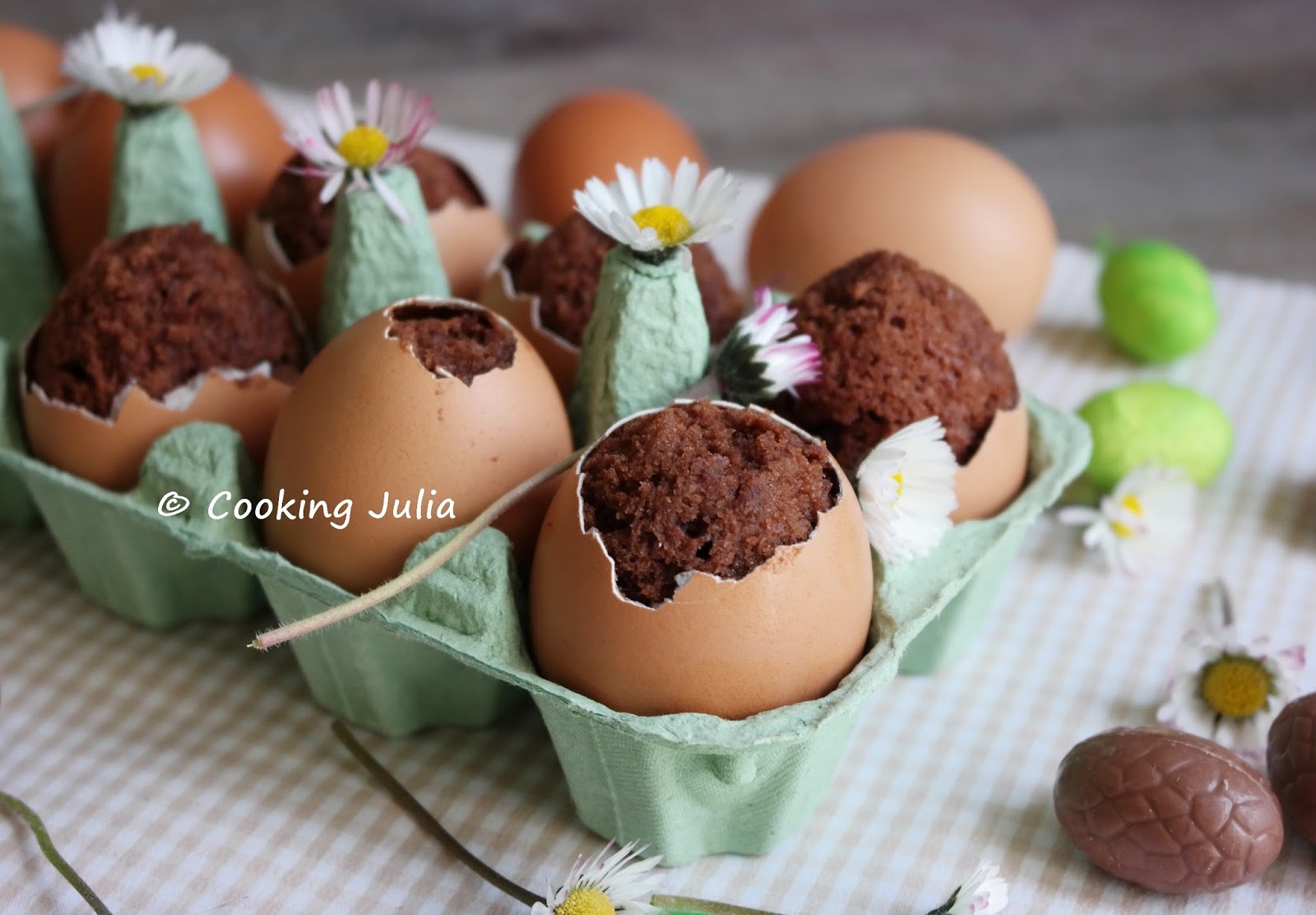 Cette année, par manque de temps, je n'avais pas prévu de faire la moindre recette sur le thème de Pâques. Et puis je suis tombée sur ces œufs trop mignons chez la charmante Cooking Lili... Alors j'ai craqué ! Hop, ce matin, malgré la journée raccourcie d'une heure, je me suis lancée dans la préparation de ces eggcakes bien de saison. Car qui dit Pâques dit pâquerette, œuf, chocolat, jardin, printemps, vert... Tout y est, même un rayon de soleil entre deux nuages !
