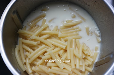 Faire cuire les macaroni al dente. Les égoutter en réservant 1 verre d'eau de cuisson (100 grammes).