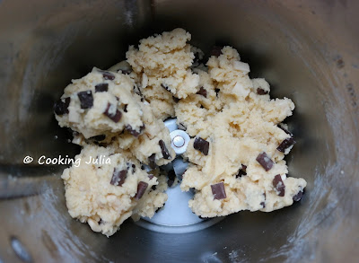 Encore une recette qu'on a pas mal vue sur les blogs, mais après avoir goûté ce cookie géant, je comprends pourquoi : il ne faut pas mettre le nez dedans sous peine de le manger en intégralité... C'est chez Thermominoux que j'ai emprunté la recette, car elle l'a déjà adaptée au Thermomix (et en plus d'être gourmande, je deviens feignante...). Merci Minoux !