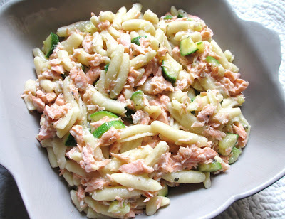 Égoutter les pâtes, les remettre dans le bol, ajouter le saumon émietté, les courgettes, l'huile d'olive, le jus de citron et du sel. Mélanger 20 secondes, vitesse 1. Verser dans un plat et servir immédiatement.