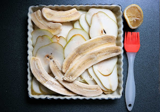 Elle est idéale pour utiliser des bananes qui commencent à noircir. Quant aux poires, les meilleures pour cette tarte sont les Conférence ou les Comice (celles que j'ai utilisées ici). Il faut veiller à ne pas les prendre trop mûres car sinon elles vont rendre trop de jus, mais pas trop vertes non plus ou alors il faudra un peu augmenter la quantité de sucre. Et si on n'aime pas la cannelle, eh bien on n'en met tout simplement pas et c'est très bon aussi...