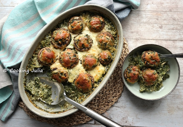 Après avoir acheté une belle cagette de champignons de Paris à un prix défiant toute concurrence, il me fallait trouver une recette pour les cuisiner rapidement. Comme ils étaient plutôt gros, j'ai décidé de les farcir. Un tour dans le frigo et j'en suis ressortie avec un reste d'épinards cuits et un fond de pot de mascarpone. En ajoutant deux ou trois autres ingrédients et en me basant sur mes autres recettes de champignons farcis, je les ai installés sur un lit de riz très parfumé et les ai recouverts de mozzarella. Partie de pas grand chose et contre toute attente, j'ai obtenu un gratin extra, qui a fait l'unanimité.