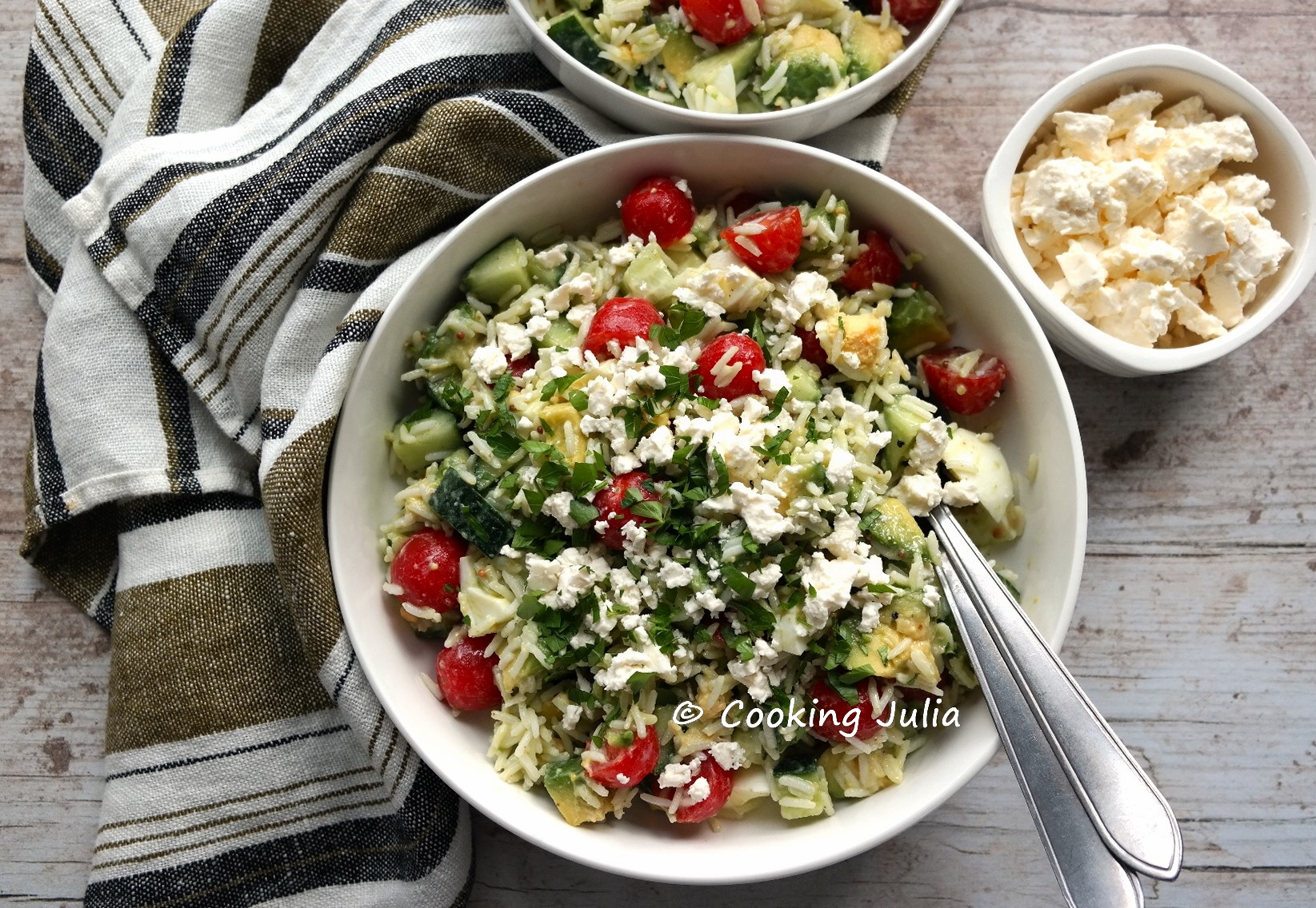 Une nouvelle recette de salade complète ne se refuse pas, surtout avec les températures qui vont enfin se montrer de saison ! A base de riz, cet assemblage d'ingrédients promet une assiette équilibrée et fraîche, riche en légumes mais avec des œufs tout de même pour l'apport de protéines, et cette petite touche de feta qui lui donne tout son caractère.